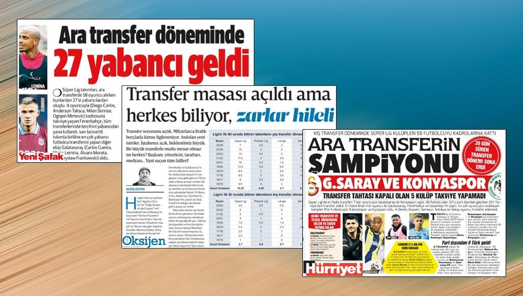 “24 Aralık-13 Ocak tarihleri arasında Fanatik, Fotomaç, Sabah, Milliyet ve Hürriyet gazetelerinde Fenerbahçe’ye 48, Galatasaray’a 46 oyuncu yakıştırılmış. Kimler yok ki listede? İlginçtir, koca transfer okyanusunda aynı isimlere ‘sarkıyorlar’.  Oysa Fenerbahçe ve Galatasaray’ın son 10 yılda devre arası transfer ortalamaları toplam 5’i zor geçiyor.”